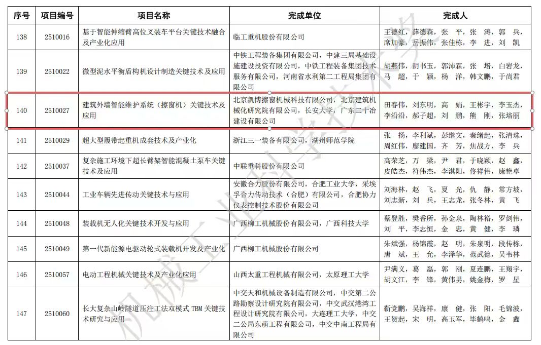 2025年度“機械工業科學技術獎”授獎項目目錄已公布,北京凱博擦窗機械科技有限公司(以下簡稱“凱博擦窗”)建筑外墻智能維護系統(擦窗機)關鍵技術及應用,榮獲“2025年度機械工業科學技術獎(科技進步獎)二等獎”,這一獎項的獲得,標志著凱博擦窗的技術實力和創新成果再次獲得行業高度認可,彰顯了凱博擦窗在國內擦窗機領域科技創新和產業化深度融合方面的引領作用,對北京建機院高空作業裝備的高端化、智能化、集成化發展具有重要的里程碑意義。